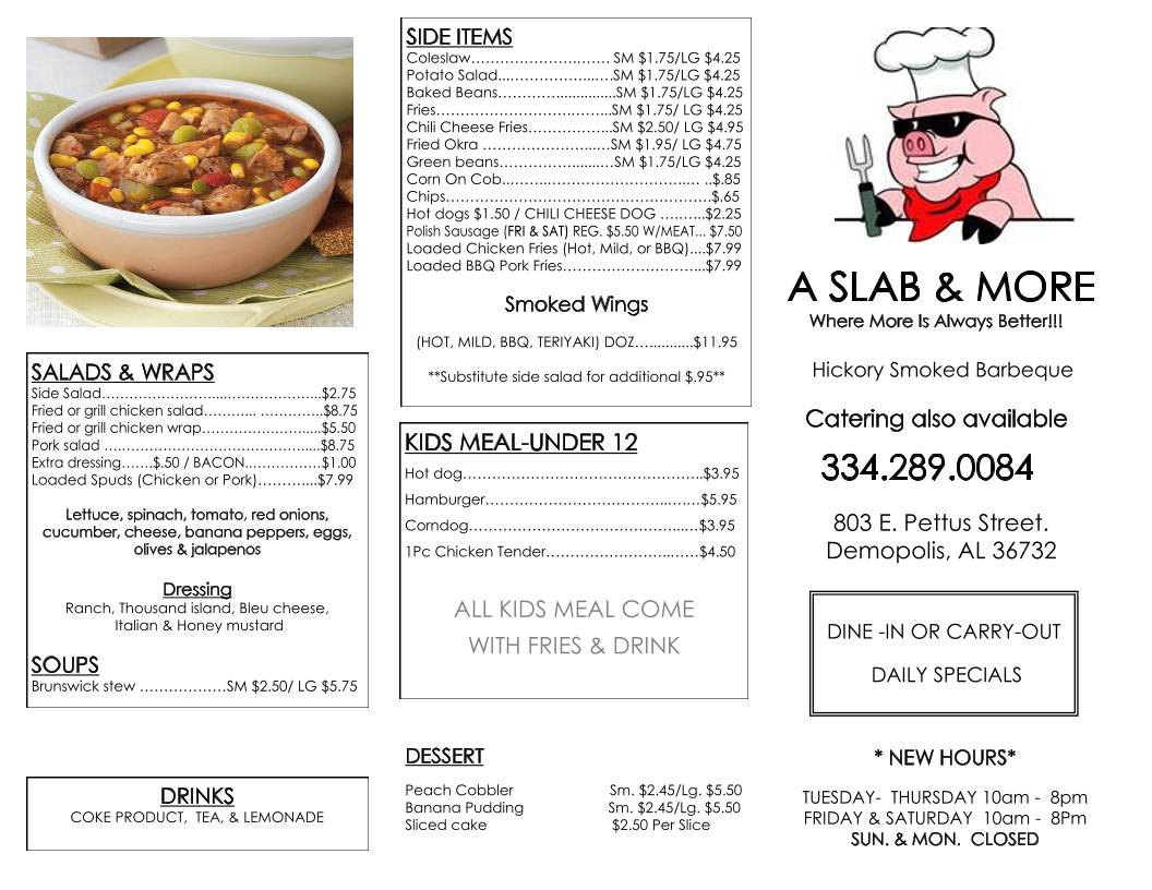 If you're in Demopolis, Alabama, and craving authentic barbecue, look no further than A Slab and More BBQ. Nestled at 803 E Pettus St, this local gem offers a mouthwatering menu that stands as a testament to true southern barbecue traditions.